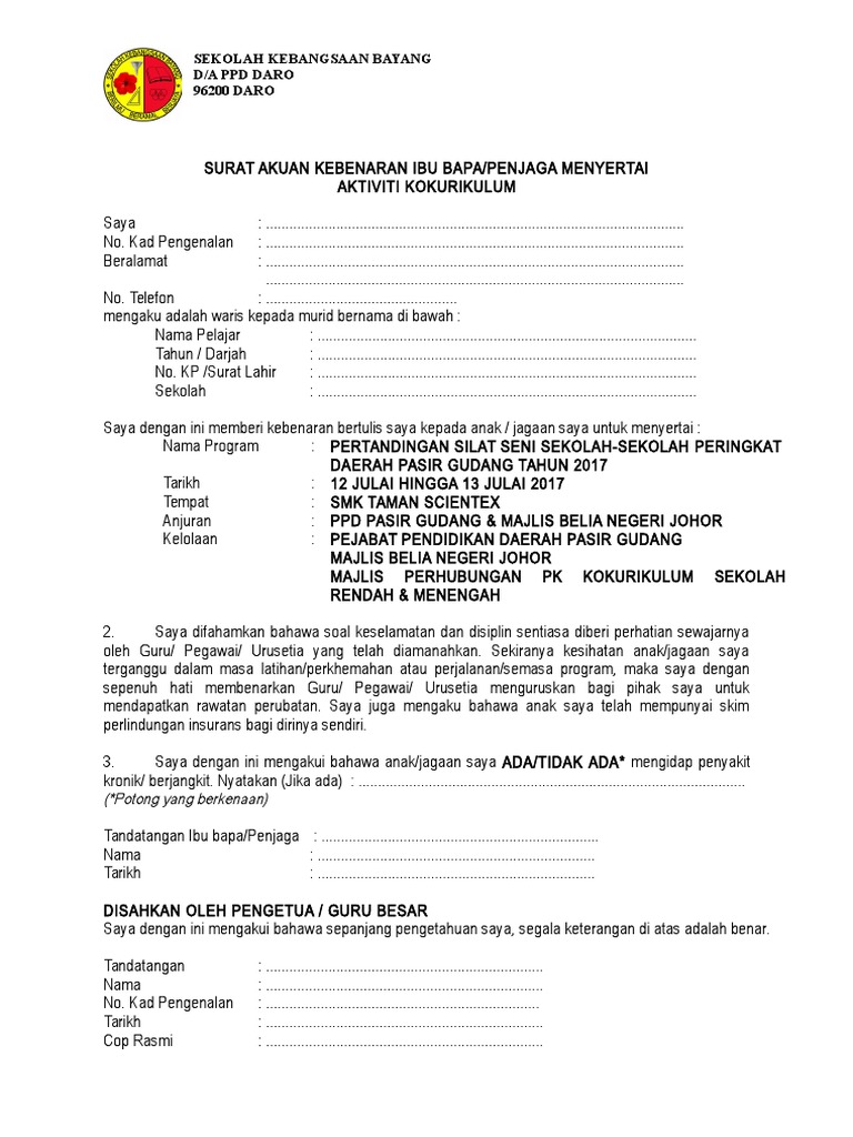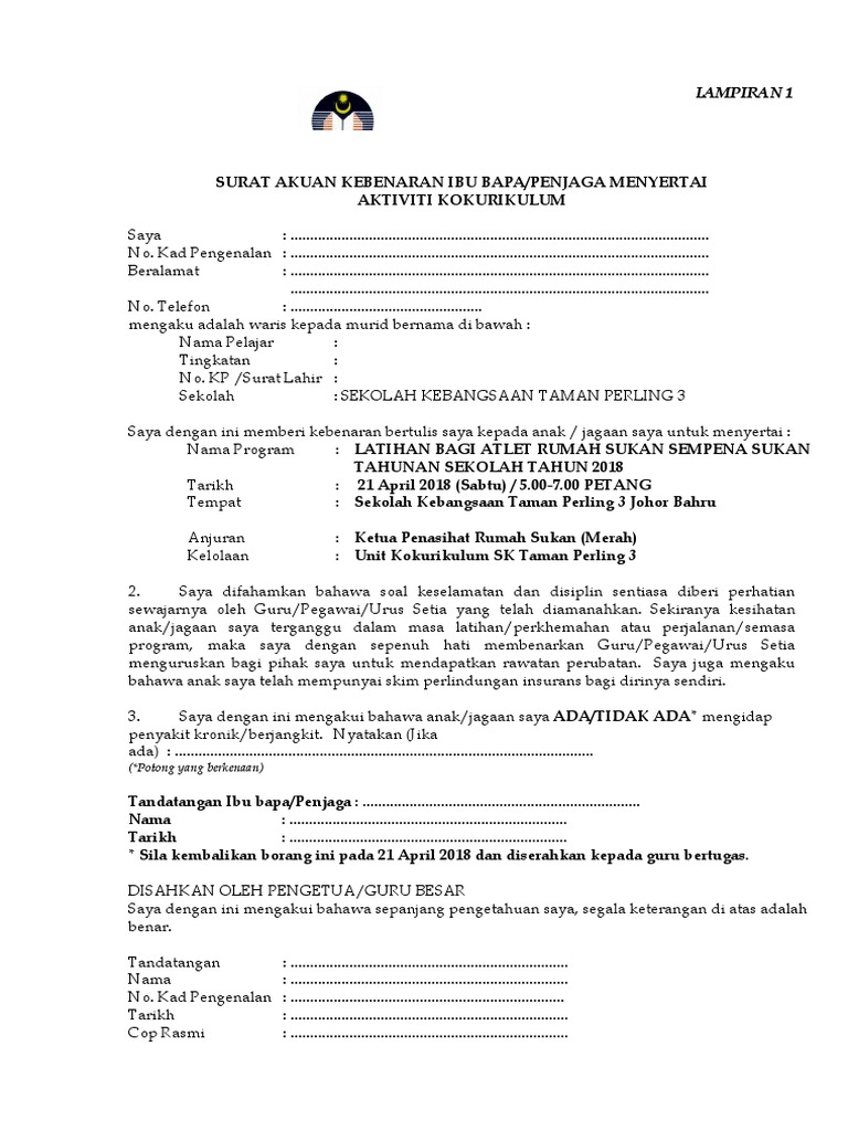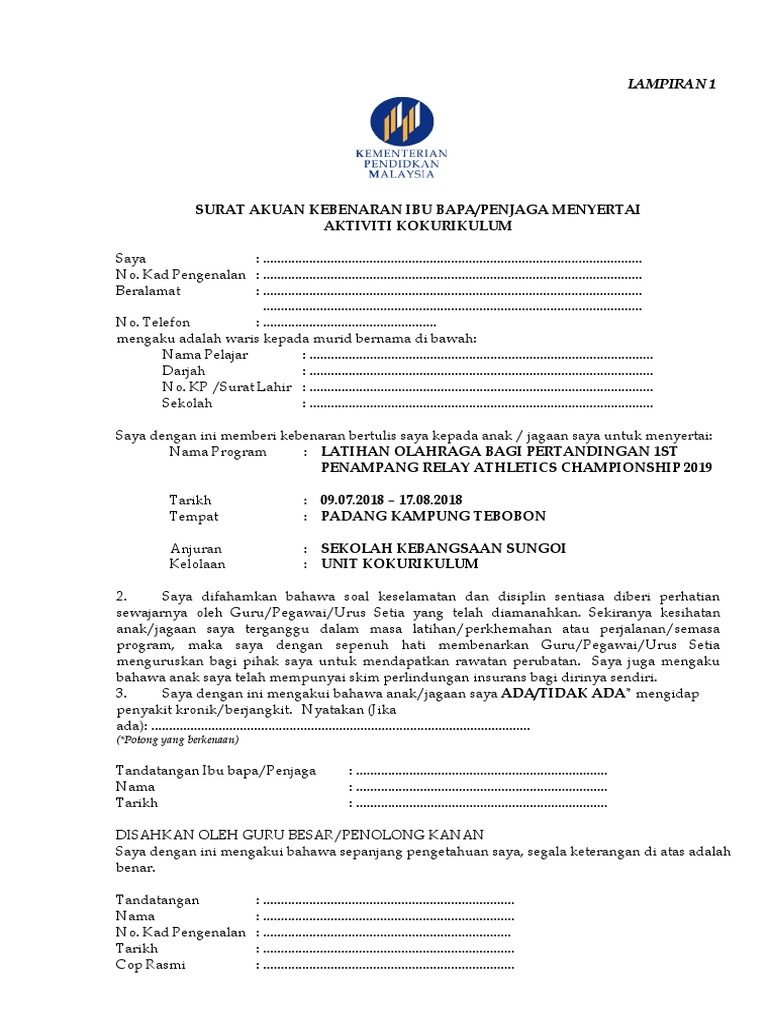 Surat akuan kebenaran ibu bapa penjaga menyertai aktiviti kokurikulum kpm. If you continue browsing the site you agree to the use of cookies on this website. Tandatangan ibu bapa penjaga waris pengakuan saksi. Penganugerahan doktor muda oleh kpm. Saya dengan ini memberi kebenaran bertulis saya kepada anak jagaan saya untuk menyertai.