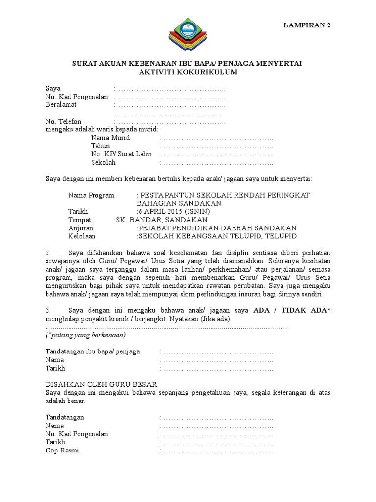 Surat akuan kebenaran waris menyertai aktiviti kokurikulum saya no kad pengenalan. Di atas adalah contoh surat manakala di bawah adalah muaturun bagi contoh surat ini. Surat akuan kebenaran ibu bapa dan penjaga menyertai aktiviti kokurikulum. Surat akuan kebenaran ibu bapa dan penjaga menyertai aktiviti kokurikulum.