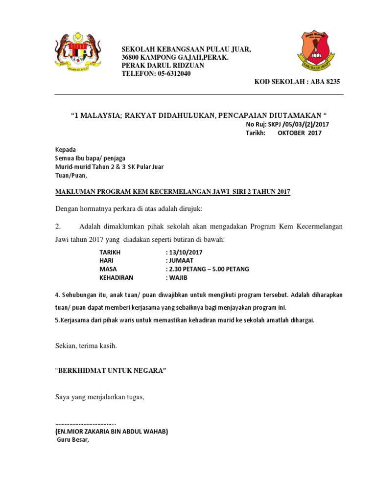 Contoh Surat Makluman Aktiviti Kokurikulum Kepada Ibu Bapa