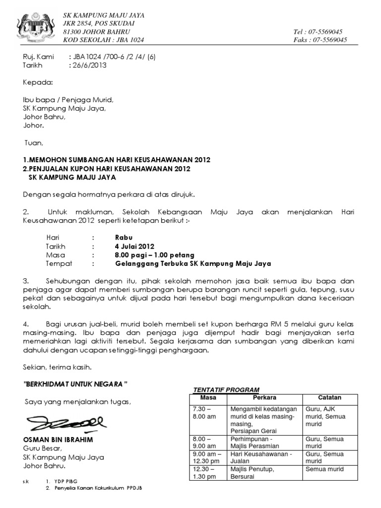 Surat Mohon Sumbangan Dan Penjualan Kupon Hari Keusahawanan 2013 Docx