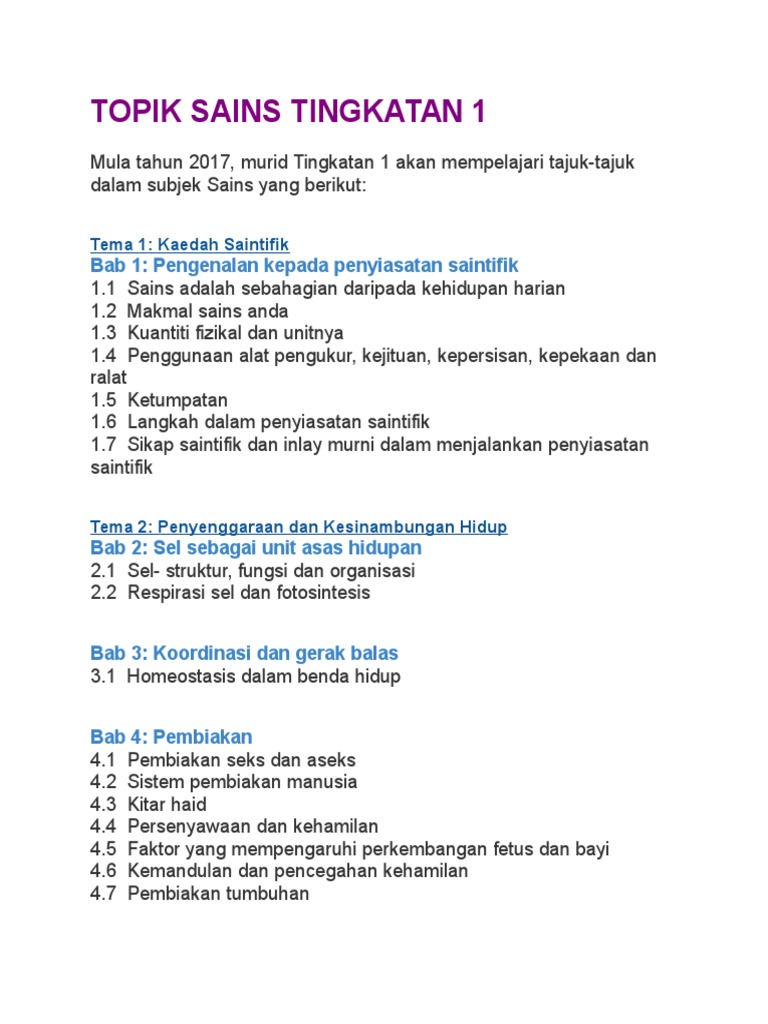 Kssm Sains Tingkatan 1 Dan 2 Tema Penyenggaraan Dan Kesinambungan Hidup November 2018