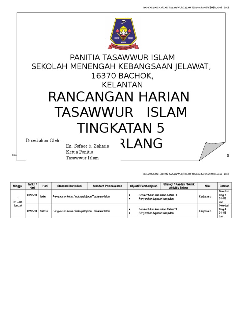 Rancangan Harian Tasawwur Islam Tingkatan 5 Cemerlang 2018