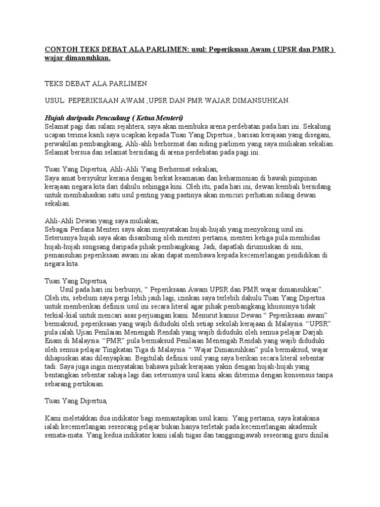305891919 Contoh Teks Debat Ala Parlimen Pemansuhan Peperiksaan Docx