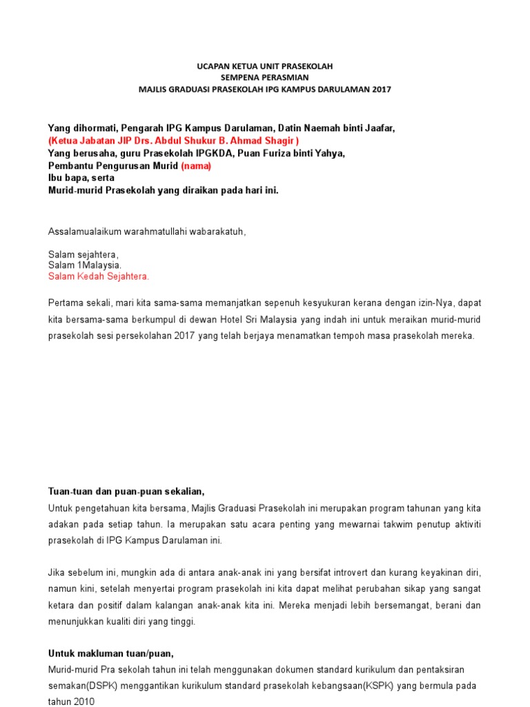 Teks Ucapan Wakil Pelajar Majlis Graduasi Tadika