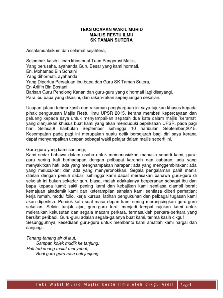 Teks Ucapan Wakil Murid Majlis Restu Ilmu