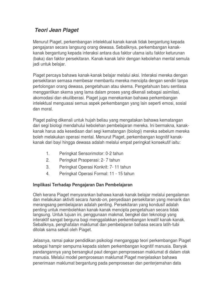 Moralitas dinilai sebagai satu set peraturan yang boleh dipatuhi dan difahami oleh kanak kanak ke tahap yang lebih besar atau lebih rendah secara amnya dikaitkan dengan idea keadilan. Piaget menyimpulkan dari penelitiannya bahwa organisme bukanlah agen yang pasif dalam perkembangan genetik. Teori jean piaget 3. Teori jean piaget 1 akomodasi ialah individu mengubah dirinya agar bersesuaian dengan apa yang diterima dari lingkungannya.