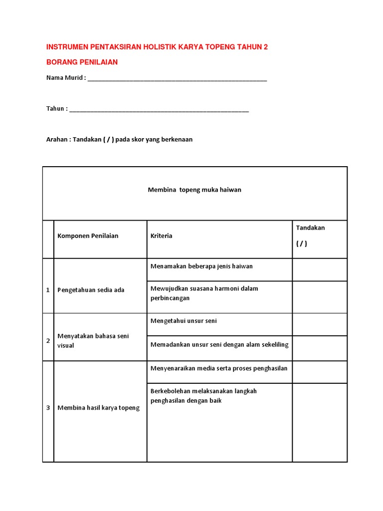 Instrumen Pentaksiran Karya Topeng Tahun 2